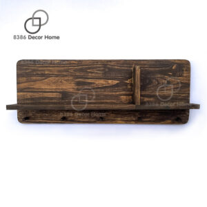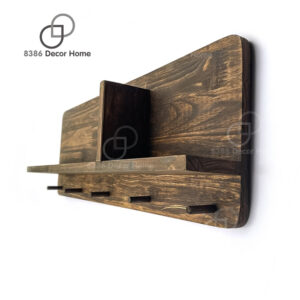 Kệ treo tường đa năng decor trang trí kèm móc treo quần áo và phụ kiện, làm từ gỗ thông tự nhiên sơn màu gốc nước màu nâu rustic, là một lựa chọn tuyệt vời để tổ chức không gian và tăng tính thẩm mỹ cho ngôi nhà của bạn. Đây là một mô tả chi tiết về sản phẩm này:
